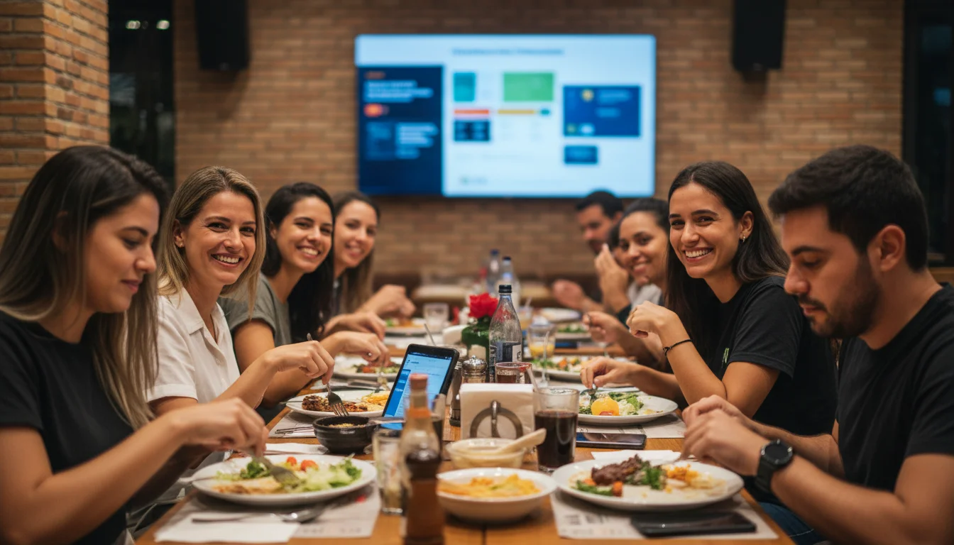 Foto de restaurante brasileiro movimentado com clientes sorridentes, dispositivos digitais e campanha de marketing digital em fundo desfocado.